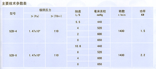 目前制造的本型號泵有:SZB—4、SZB-8。其中4(8)表示當水銀柱高為520毫米時的氣量(升/秒)。