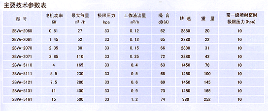 2BVA系列真空泵適于抽除氣體和水蒸汽,吸氣壓力可以達到33mbar決壓(97%真空度)當真空泵氣壓力低于80mbar的狀態下長期工作時,應聯接氣蝕保護管以對泵進行保護,如配大氣噴射器,吸氣壓力可達到10mbar。噴射器的可直接安裝在真空泵上。作為壓縮機用時,其壓力最大至0.26mbar(絕壓)。